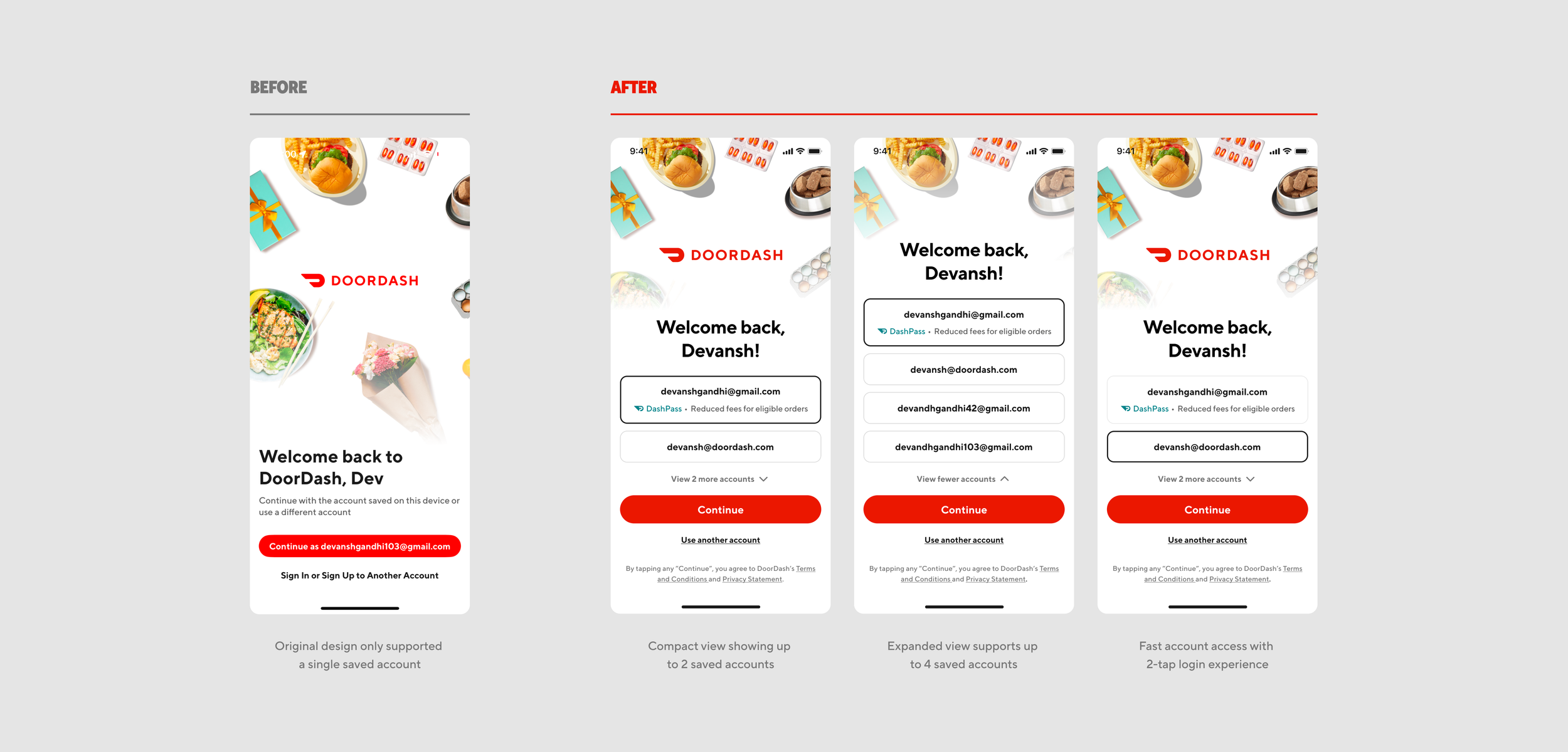 Roughly 50% of DoorDash users have multiple accounts, but our original "Save Login Info" feature only supported one saved account. This led to friction during re-login, and many users continued to log out and back in manually, creating unnecessary churn and extra steps.