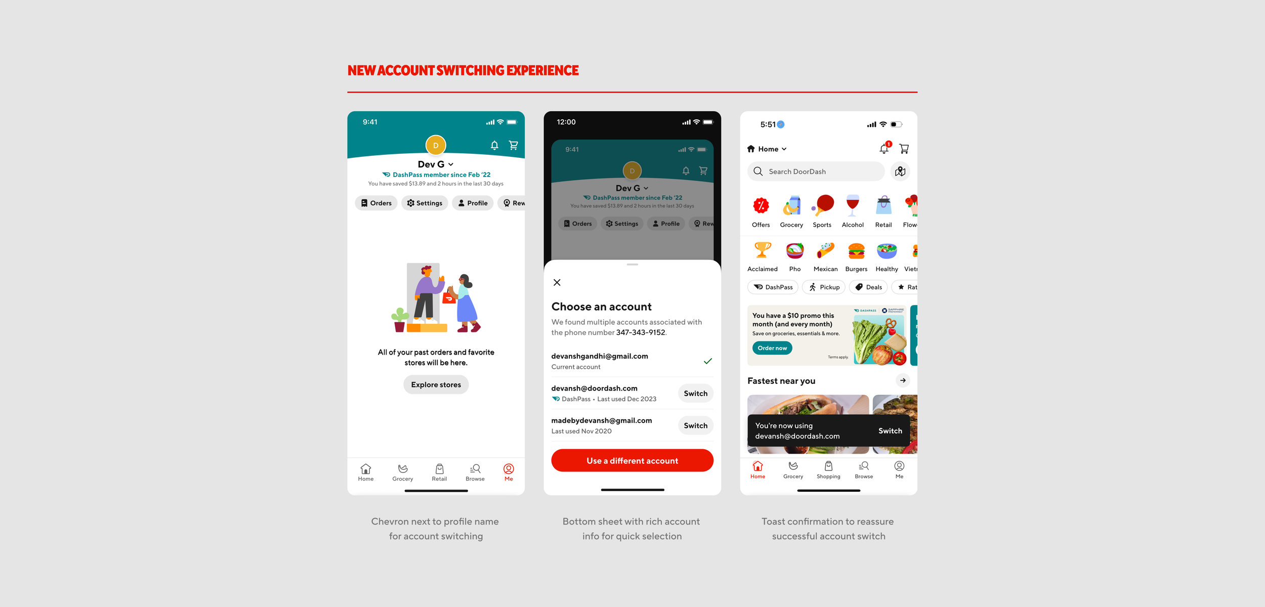 After exploring multiple directions with the Feed and DashPass teams, I redesigned the entry point to live directly in the profile header as a down chevron next to the profile name. This placement felt intuitive and reduced the switch account interaction to a single tap, while minimizing disruption to high-traffic elements like Orders and still aligning with existing design patterns.