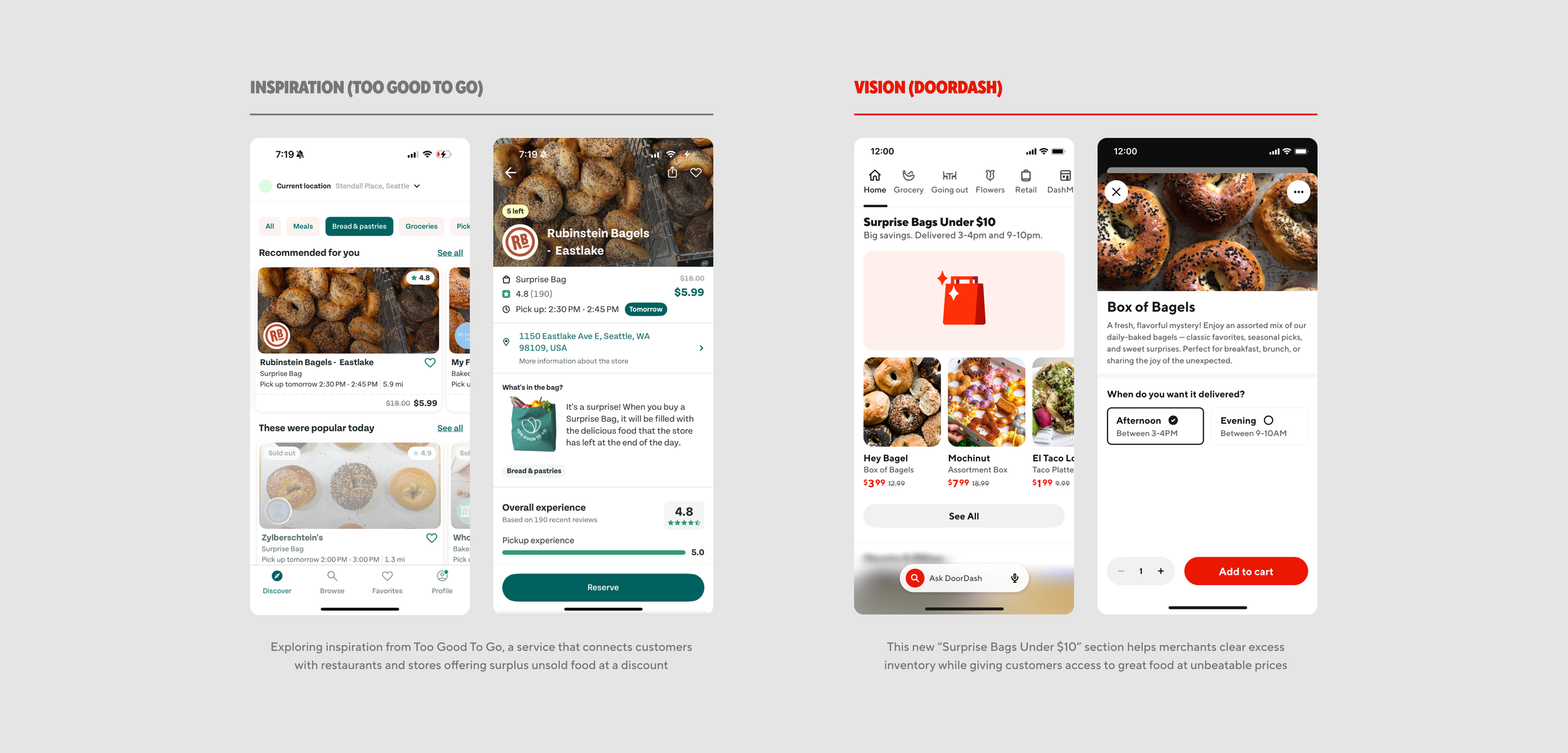 These concepts were presented to senior leadership as part of a broader affordability strategy, with the goal of informing future product directions. If implemented, they’re expected to increase GOV and MAU by improving perceived value, reducing food waste, and tailoring the DoorDash experience to better meet the needs of price-sensitive users.