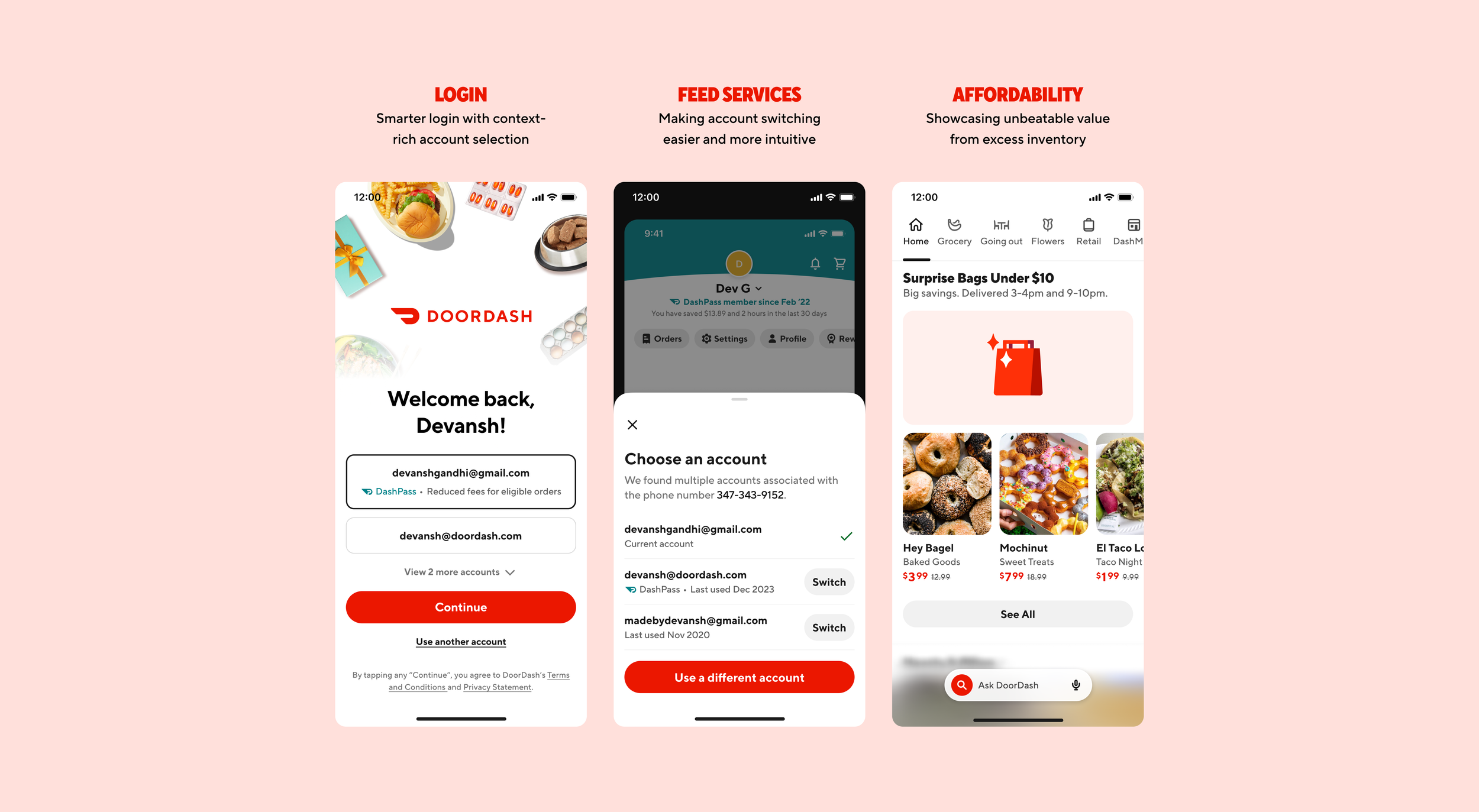 During my time on the Growth team at DoorDash, I worked across login, authentication, and affordability to improve key parts of the customer experience. These projects weren’t large-scale redesigns — they were fast, high-impact optimizations aimed at reducing friction, increasing trust, and unlocking value for both users and merchants. From smarter account switching to surfacing affordable deals, each initiative focused on clear hypotheses, efficient execution, and measurable outcomes. Below is a collection of those improvements, designed and shipped over a 6-month contract.