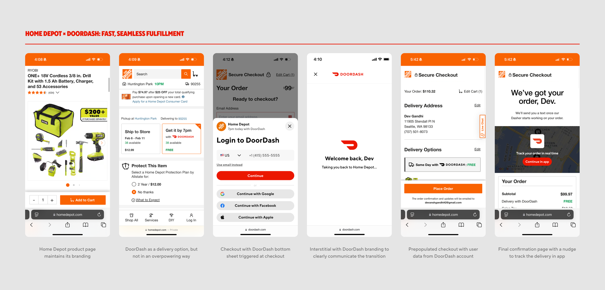 As part of a broader initiative to productize DoorDash login, I designed a conceptual flow for how external partners like Home Depot could embed DoorDash services into their own experiences. The end-to-end design maintains the partner’s brand while introducing lightweight, intuitive moments for users to log in with DoorDash, access saved account details, check out in one tap, and unlock benefits like 1-hour delivery for eligible items.